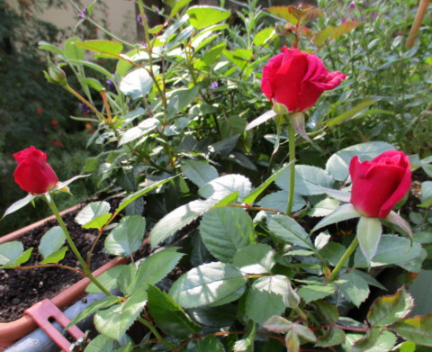 Spätsommer, Frühherbst – ich nenne diese wundervolle Jahreszeit gerne mit dem altmodischen Namen. Eigentlich leitet er sich von den herumfliegenden Spinnweben (wîben, weiben) ab, und von Weben leitet sich angeblich auch das Wort „Weib“ (die mit der gewebten Haube) ab. Wie auch immer – ich freue mich, daß alte Weiber wie ich mit einer so schönen Jahreszeit in Verbindung gebracht werden. Die Rosen auf meinem Balkon blühen zum zweiten Mal, und irgendwie ist alles in einem rosigen Licht.