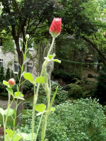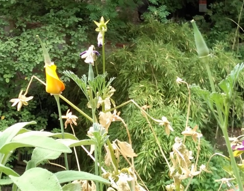 Die Art, wie der gelbe Mohn sein spitzes grünes Hütchen nach oben wegschiebt, finde ich allerliebst. Die Hornveilchen sind über die größte Pracht schon hinüber und samen fleißig aus. Salbei und Rosmarin duften und würzen, übrigens kann man daraus auch schöne Duftsträuße machen. Der rote Klee ist von einer der unzähligen Kleearten, die ich noch nicht kenne. Neben dem Rosmarin sieht man noch ein paar Kornblumen, die meisten sind schon hinüber (und ich hoffe, auch sie verbreiten sich gut). Dann gibt es noch einiges Hübsche, was ich nicht kenne, und etwas knospt verheißungsvoll. Den Hummeln gefällt es auch!