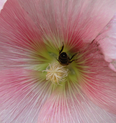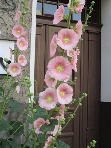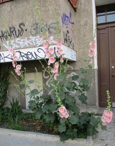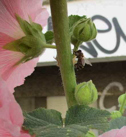 Die Häuserfront wirkt etwas heruntergekommen, aber der Balkon gehört jemandem mit grünem Daumen (das zeigen die zahlreichen Blumentöpfe, die ich aus Gründen der Diskretion nicht abgelichtet habe), und die Malve davor ist ein außergewöhnliches Prachtstück! Die Biene fühlt sich offenbar auch wohl darin, sie ließ sich von mir nicht stören.