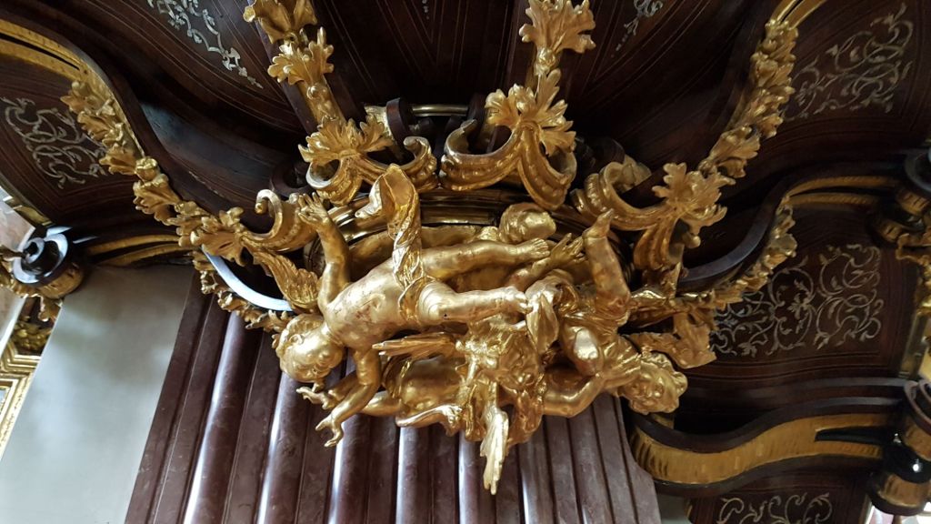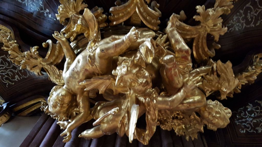 Unter der Kanzel zwei Putten, die ein Dämönchen besiegen.