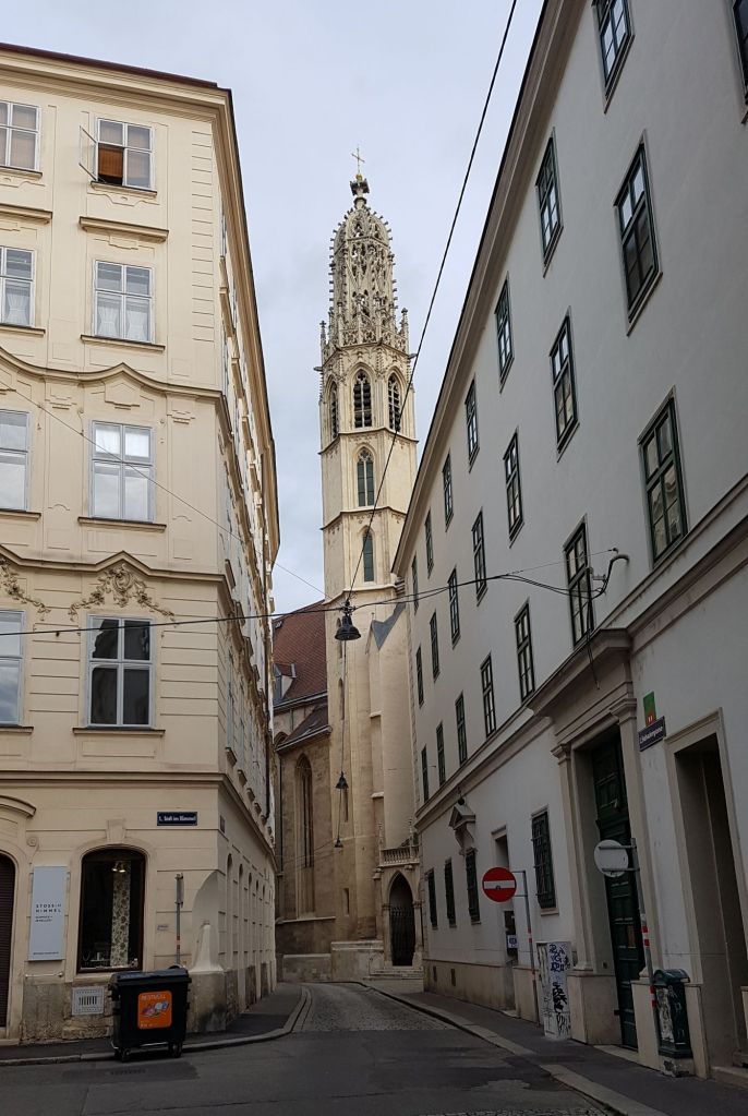 Maria am Gestade liegt ziemlich hoch über der Donau. Davor stehen seit einigen Jahrhunderten Häuser dicht an dicht. Aber zu Beginn des 12. Jhs., als diese Kirche erbaut wurde, war der blick zur Donau noch völlig frei.