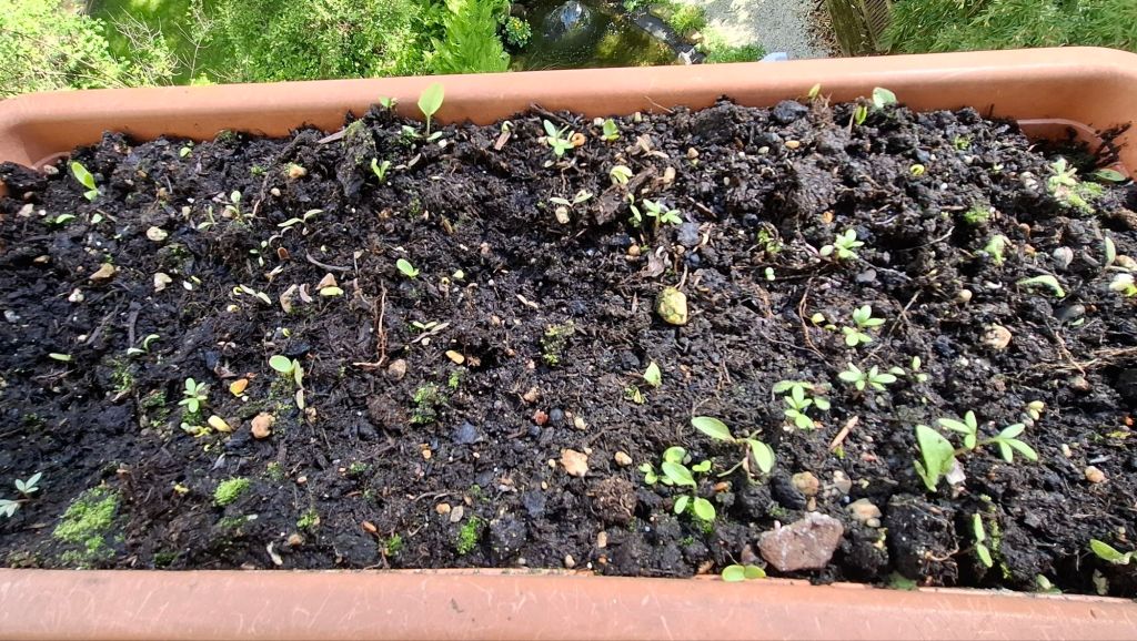 Ich habe in die Balkonkästen insektenfreundliche Sommerblumen gesät: Eine Mischung namens Bienenparadies (davon hatte ich so viel, daß auch der Vorgarten und die Baumscheiben vorm Haus etwas abbekommen haben) und einen Kasten voll Kornblumen.
