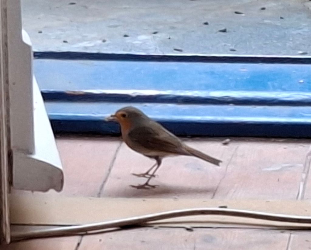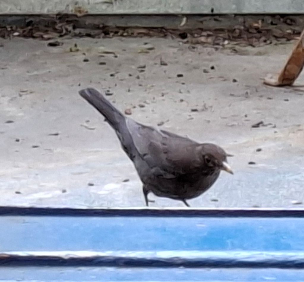 Die Amsel schaut zwar über die Schwelle, bleibt aber lieber draußen.