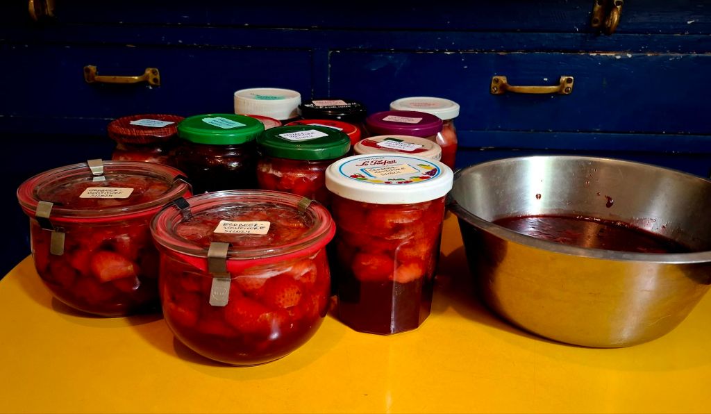 Es war noch Geld für Erdbeeren übrig. Also wurden es noch dreizehn Gläser Erdbeermarmelade (mit verschieden hohem Fruchtanteil, weil ich nicht geschafft habe, die Früchte gerecht auf die Gläser zu verteilen), eine Schüssel Marmelade ohne Fruchtstücke (weil ich keine passenden Gläser mehr hatte) und eine Schüssel rohe Erdbeeren mit Joghurt, letzteres ein herrliches Mittagsmahl.