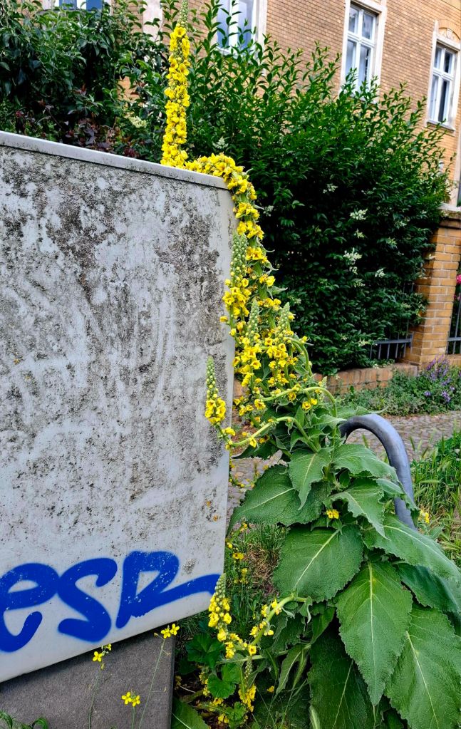 Das ist mal eine mächtige Blume! Und sie schmiegt sich so lieb an den Stromkasten, obwohl er eher reizlos ist. Vielleicht sieht sie seine inneren Werte. Oder sie mag den tag esr, der auf den Propheten Esra hindeuten könnte.
