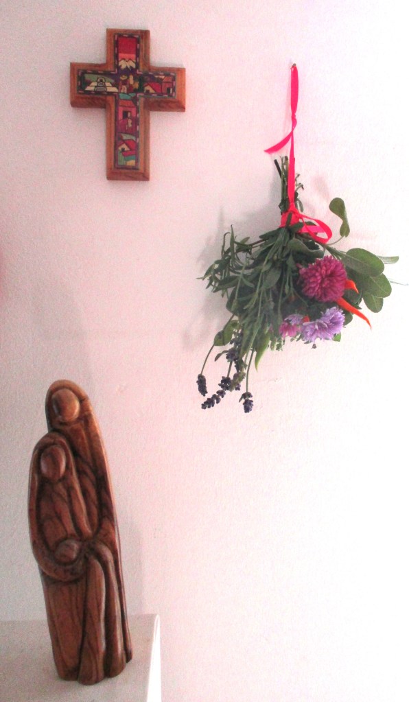 Zu Mariä Himmelfahrt werden Sträuße aus duftenden Kräutern gebunden und in der Messe gesegnet. Diese Kräuterbuschen sind gut für die Raumluft, und die Kräuter kann man auch in der Küche nutzen. Ich mache das allerdings nie, ich habe den duftenden Strauß lieber in meinem großen Zimmer, in dem ich arbeite und schlafe, und freue mich an dem feinen, wohltuenden Duft. In meinem Buschen sind heuer Lavendel, Majoran, Thymian, Rosmarin, Salbei, kleine Spitzpaprika und Astern. Sieben oder neun Zutaten sind traditionelle Zahlen für den Kräuterbuschen – es gibt allerdings auch Traditionen mit wesentlich mehr Zutaten. Das kommt sicher auch darauf an, in welcher Landschaft man die Kräuter sammelt.