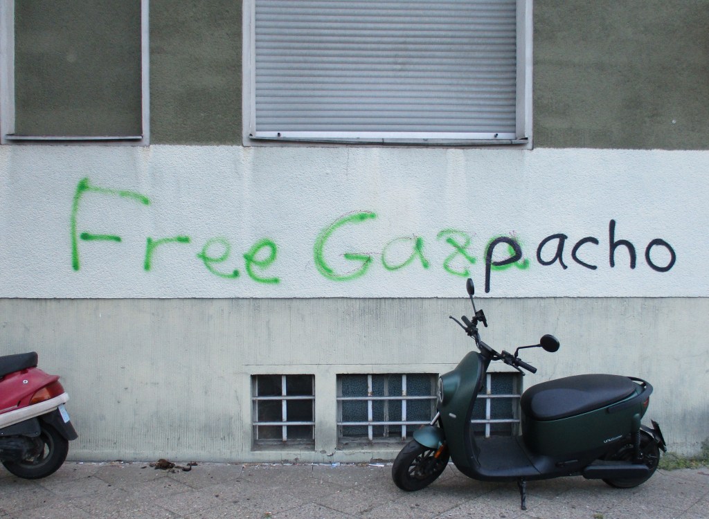 Und an einen Sprayer (obwohl ich meistens gegen unerbetene Graffiti an Häusern bin), weil er den dummen Slogan „Free Gaza“ zu der gänzlich unpolitischen, menschenfreundlichen Bitte um „Free Gazpacho“ geändert hat.