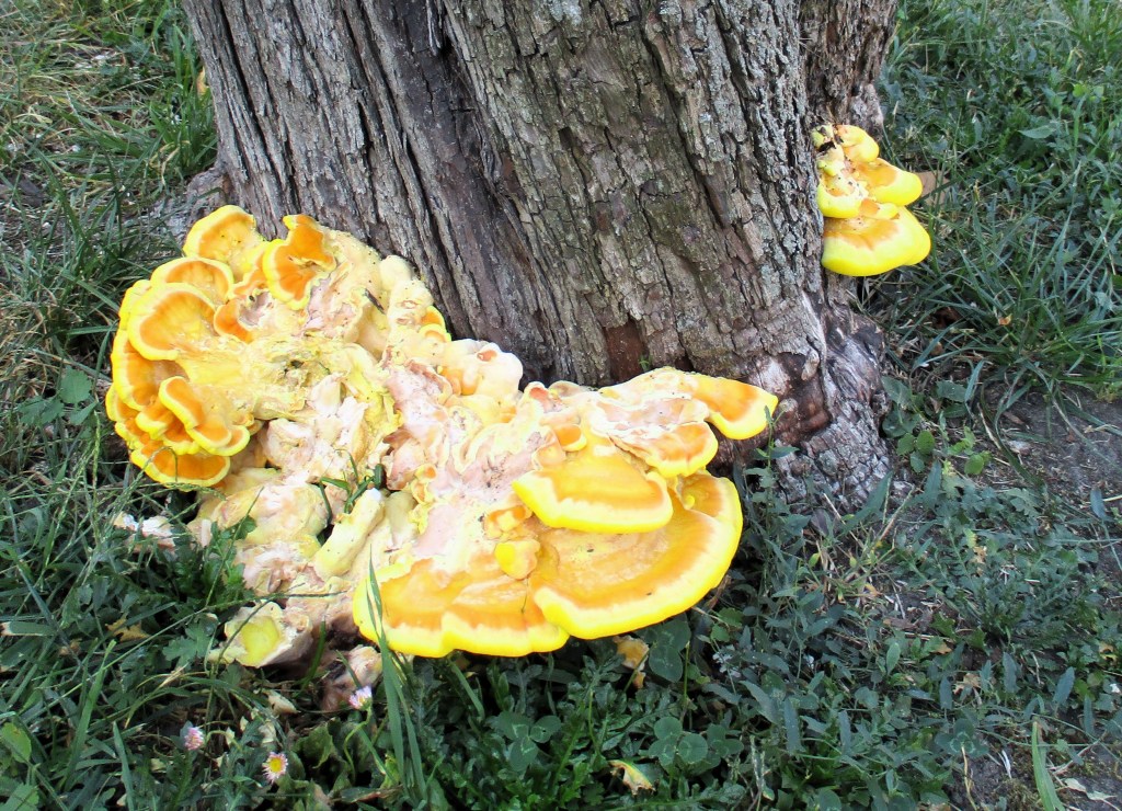 Alarmierend gelb ist er und zersetzt einen Baumstumpf auf dem Schillerplatz in Friedenau – der Gemeine Schwefelporling (Laetiporus sulphureus). Junge Exemplare sind essbar und sollen nach Hühnchen schmecken. Diesen will ich aber auch angesichts seines Alters sowie zahlreicher Hunde, die vermutlich auch diesen Baumstumpf schon markiert haben, lieber nur angucken.