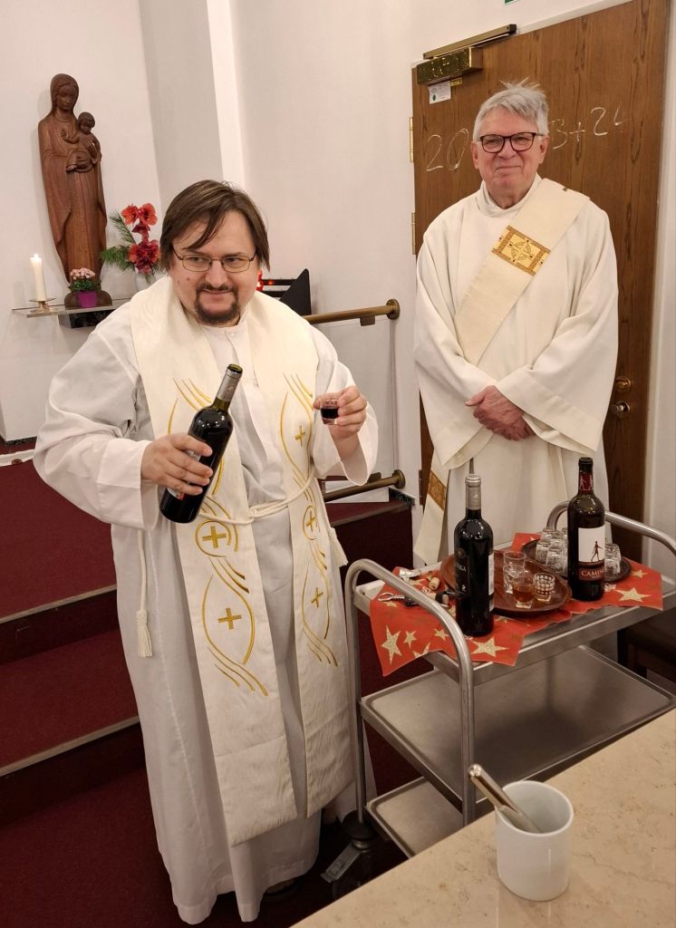 Nach der Messe segnet der Priester eine Flasche Wein (oder mehrere, Segen schadet nie) und verteilt ihn in kleine Gläser. Schnapsgläser eignen sich, wenn die Messe morgens stattfand! (Es handelt sich dabei nicht um eine Wandlung wie in der Messe, sondern weiterhin um Wein.) Jeder, der will,  bekommt ein Gläschen.