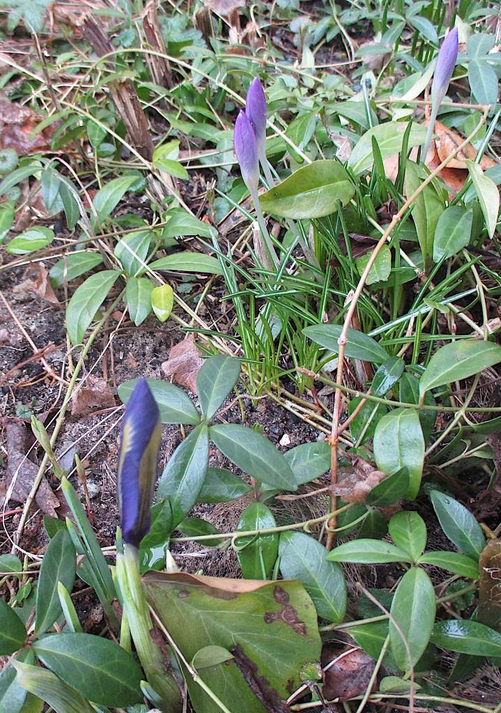 Noch mehr Krokus und im Vordergrund eine Zwergiris, auch noch geschlossen.