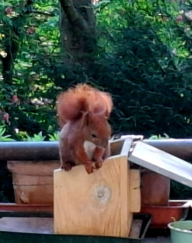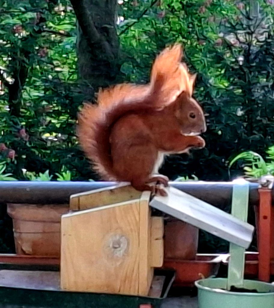 Zwei hungrige Gäste kamen – das Hörnchen wie üblich an die Futterstation, die Amsel gleich ins Zimmer. (Wenn ich vom Balkon komme und an den Schuhen Reste vom Vogelfutter habe, ist das nicht verwunderlich.)