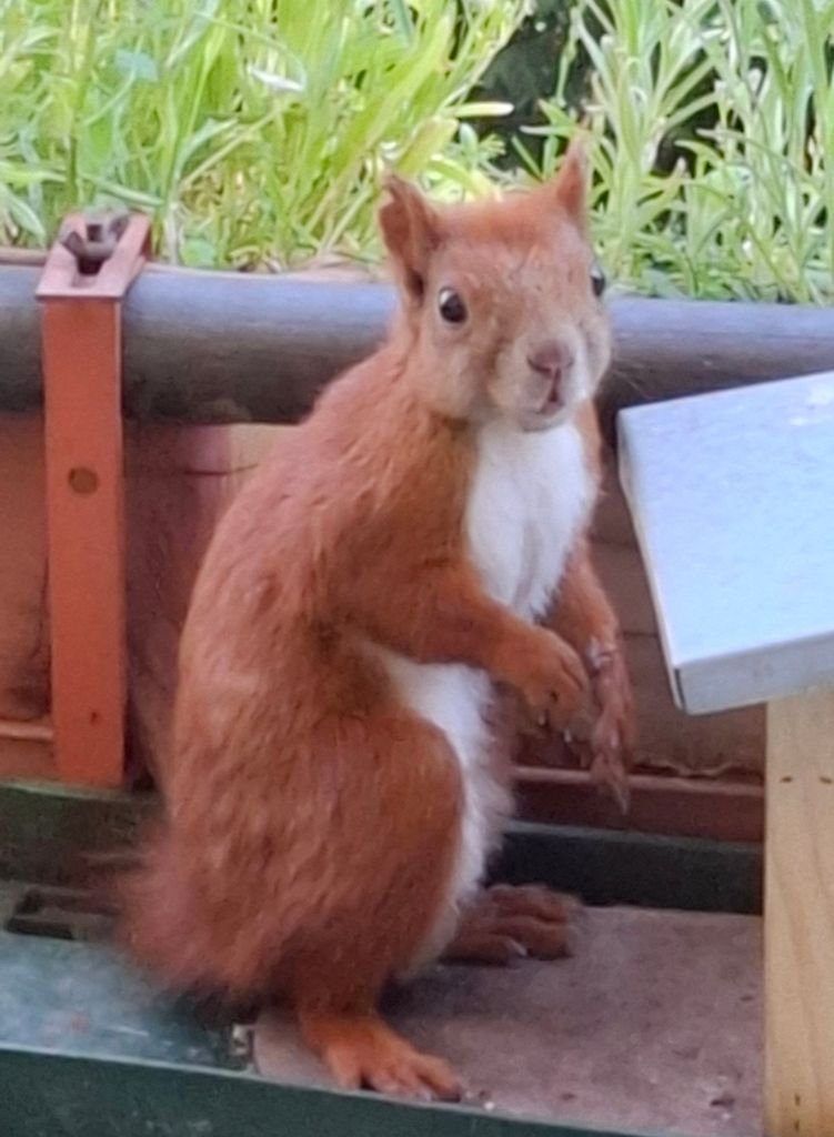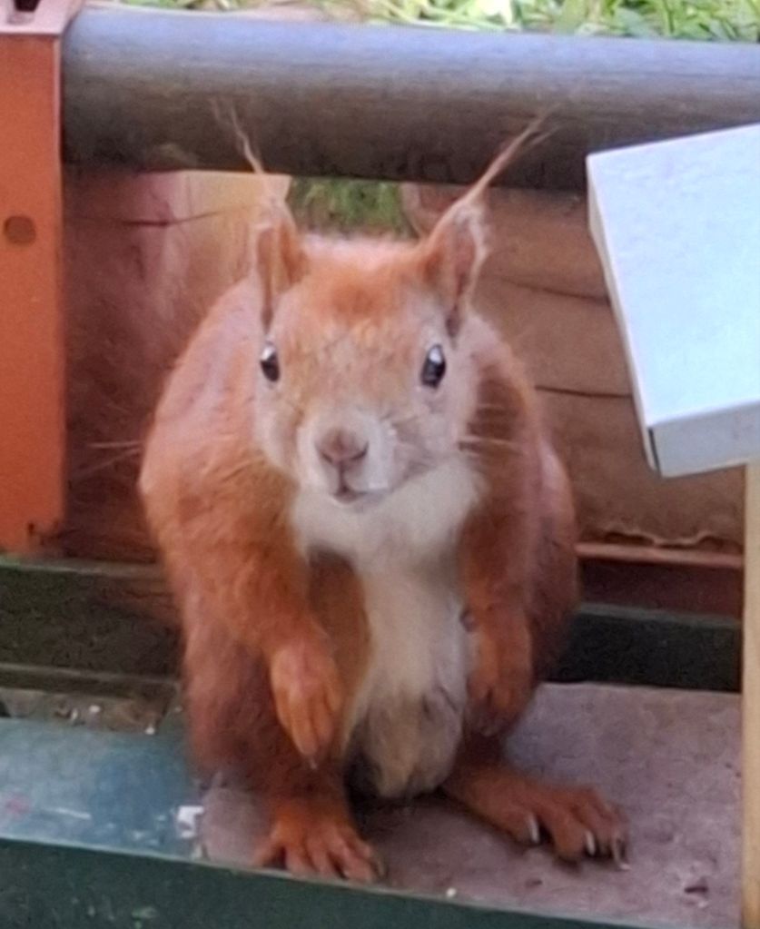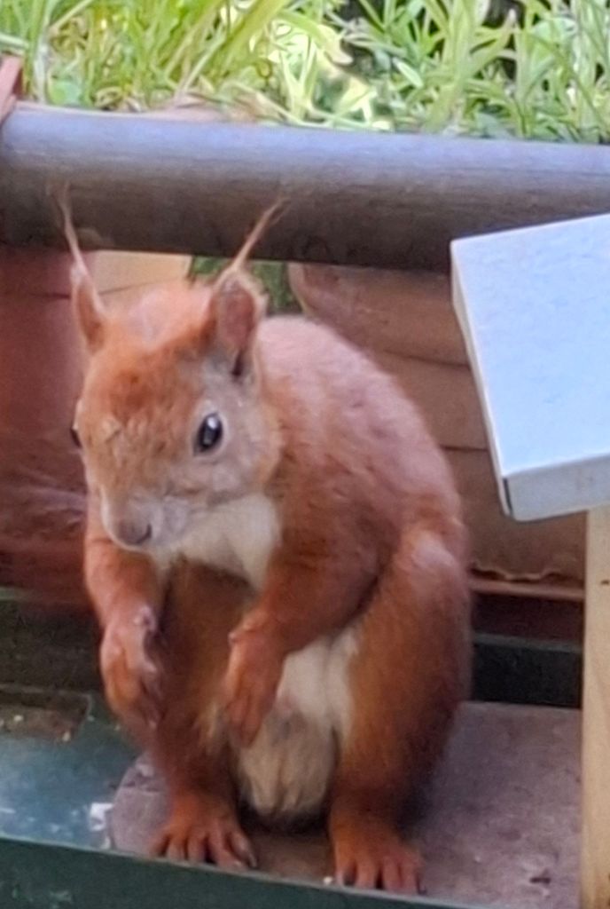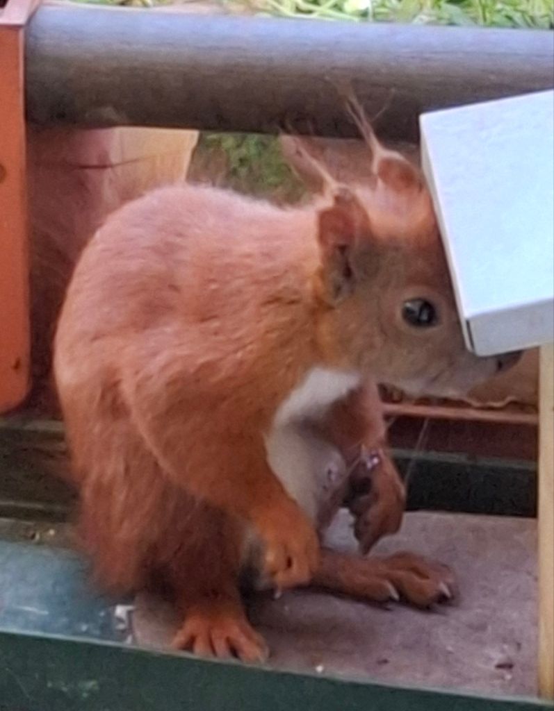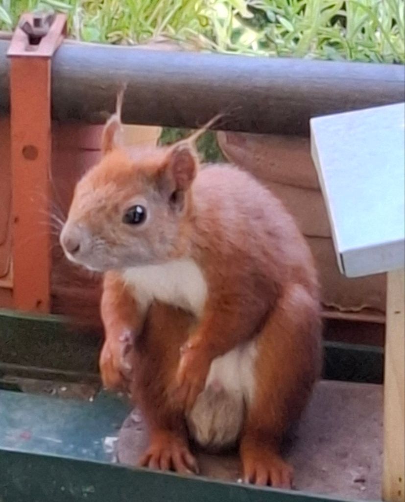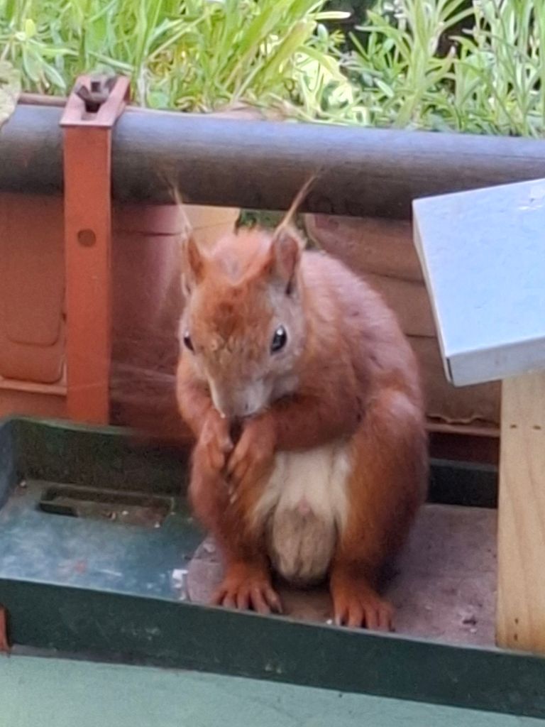 Heute gelang es mir, die Balkontür zu öffnen, ohne daß Hörnchen zu verscheuchen! Es guckte nur ganz kurz hoch, registrierte „ach, nur das Menschenweibchen“ und fraß weiter.