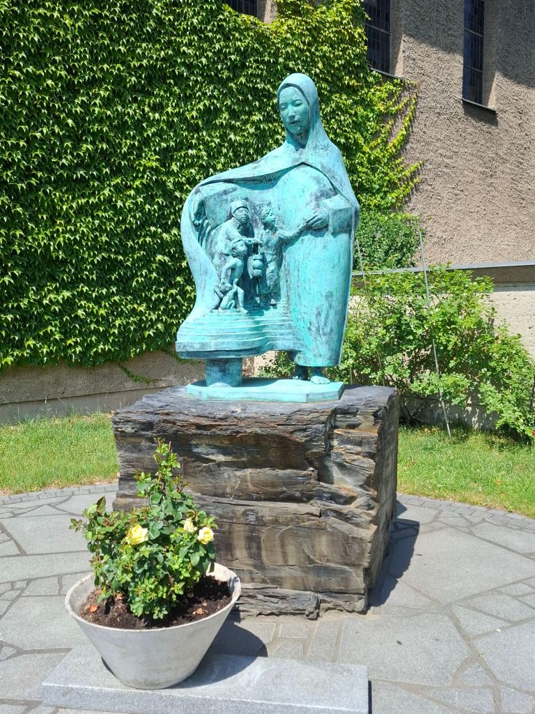 Anlässlich der Bestattung einer katholischen Koreanerin (die ich kannte und sehr gern mochte) habe ich heute diese Madonnenfigur entdeckt. Die koreanische Gemeinde hat ihr kleines Gemeindehaus hinter der Kirche auf dem St-Matthias-Friedhof, und obwohl ich auf dem Friedhof eine zeitlang gearbeitet habe, habe ich diese schöne Bronzefigur noch nie gesehen.