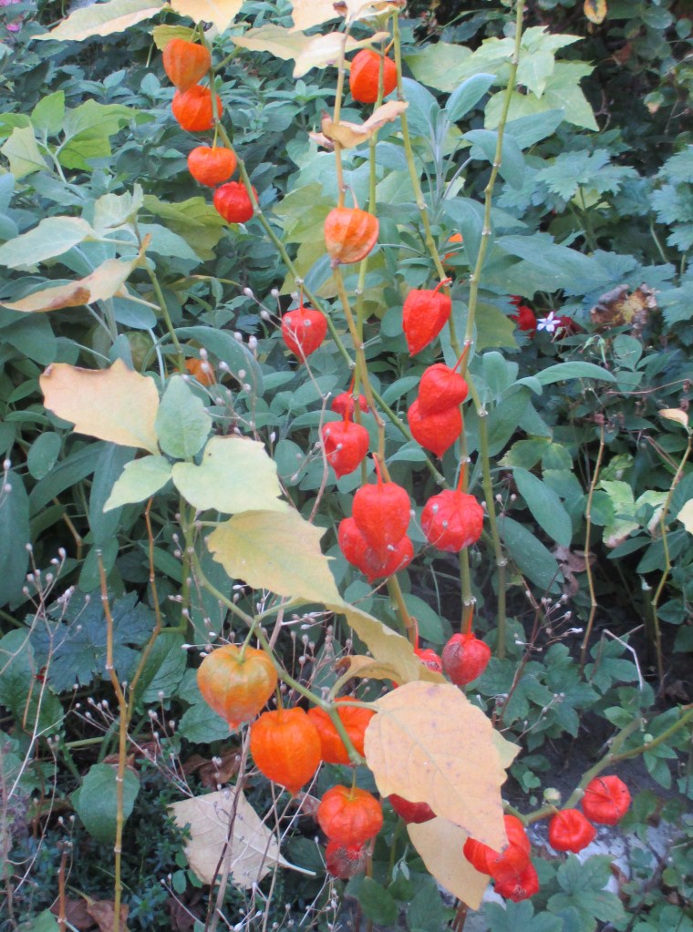 Die Lampionblumen (Physalis alkekengi) stellen ihre orangefarbenen Fruchthüllen zur Schau.
