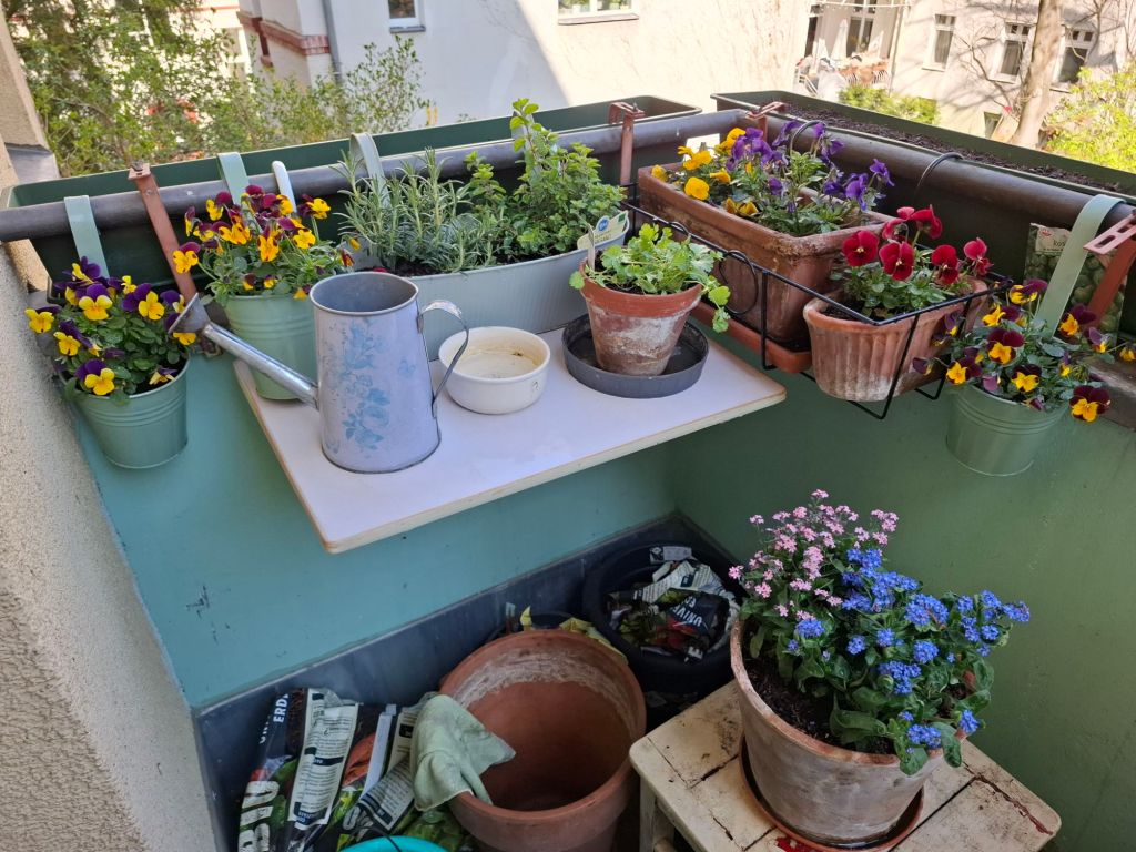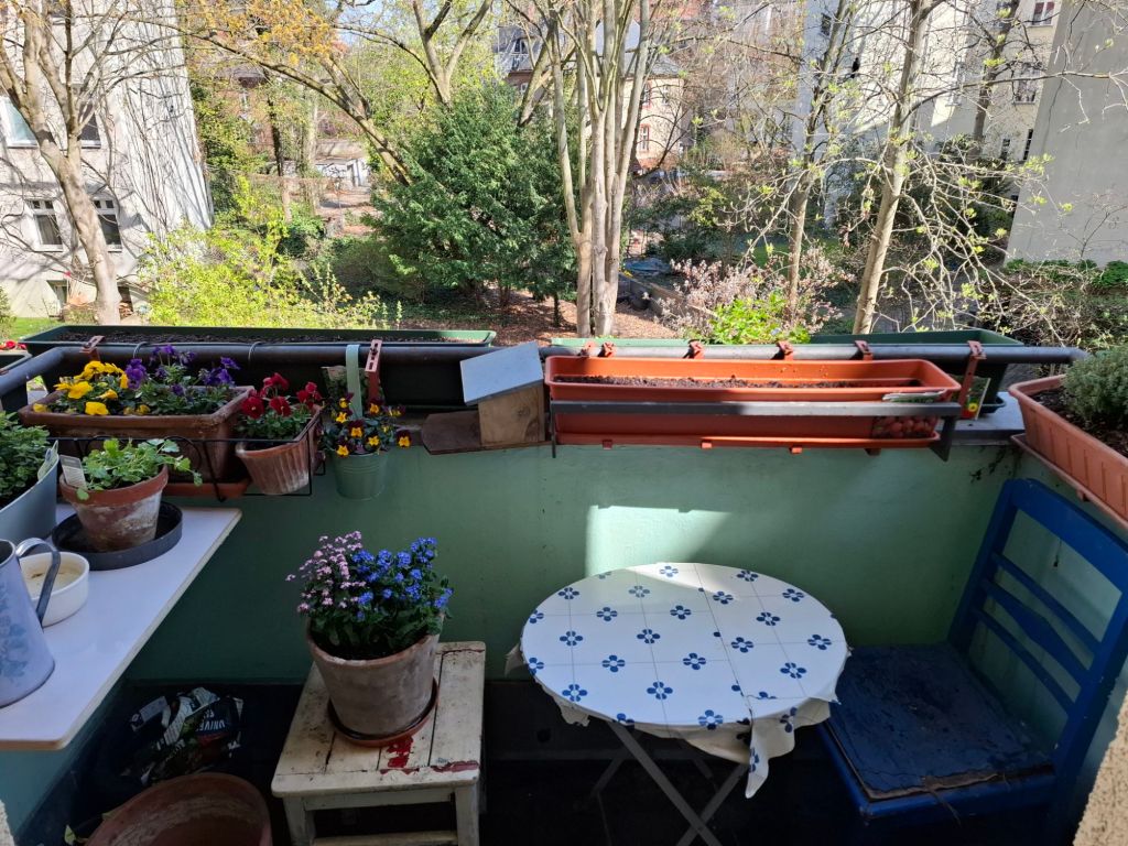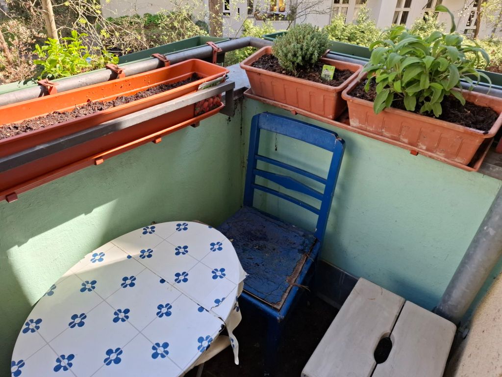 Manchmal ist es gut, in den Keller zu gehen und nachzuschauen,  ob da etwas Nützliches ist. Da war dies kleine einhakbare Klapptischchen, das gut auf den Balkon passt. Außerdem viel Holz (ein alter Ikea-Schrank in Einzelteilen), aus dem ich demnächst eine neue Sitzfläche für den blauen Stuhl machen werde. Im Gästezimmer habe ich noch einen Hocker gefunden. Damit ist besiegelt,  dass ich vorerst keine Balkonstühle brauche.