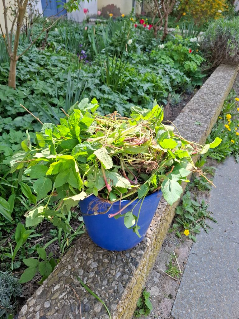 Er überwuchert den halben Vorgarten, und nicht einmal Geranium kann sich dagegen durchsetzen. Das ist frech und hat zu unterbleiben, und so machte ich mich heute daran, den Vorgarten zu entgierschen. Das ist wegen des zähen Wurzelwerks eine langwierige Arbeit, aber immerhin konnte ich heute einigen Tulpen und einem kleinen Rosenbusch Luft verschaffen. Die Maiglöckchen werden nun auch sichtbar und bereiten sich schon auf ihren Monat vor.