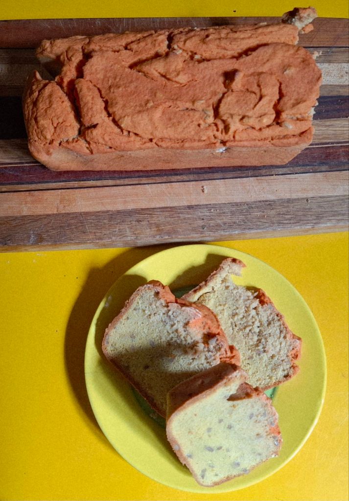 Das Ergebnis ist ein eiweißreiches, im Vergleich zu Weizen- oder Roggenbrot kalorienarmes Brot, außen knusprig, innen weich. Und mit dieser unglaublichen Farbe!